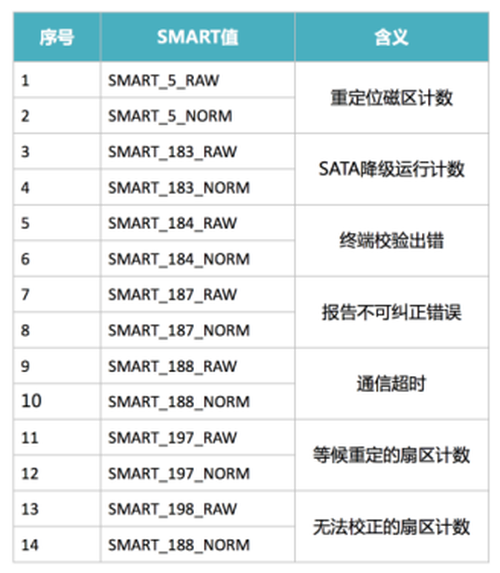 硬盘本身提供了SMART数据(Self-Monitoring Analysis and Reporting Technology)。SMART是90年代定义的硬盘状态检测和预警系统的规范,提供了磁头、磁盘、电机、电路等硬盘硬件的运行数据。目前几乎所有的硬盘厂商都已经支持了该规范。下表列出了与故障相关的SMART值。