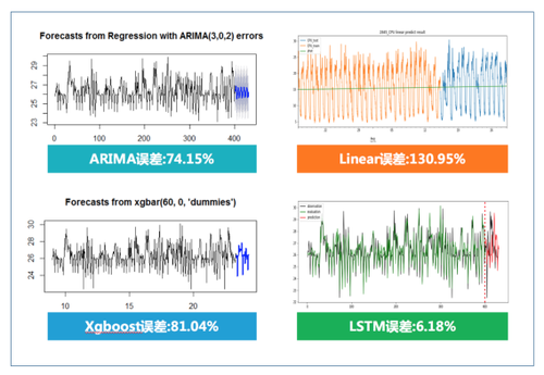 经典的时间序列预测算法有ARIMA、线性回归、深度学习算法等。这些算法有各自的优劣势,产品会根据不同的用户应用场景来选择不同的算法。图8展示了各个算法的实际效果。